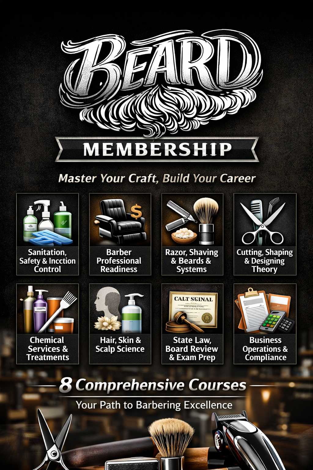 BEARD Membership provides all-access entry to eight core barbering courses covering safety, technical systems, design theory, science, state law, and business operations. The program is structured to guide learners through essential professional standards, supporting skill development, licensure preparation, and long-term career readiness through a unified learning pathway.